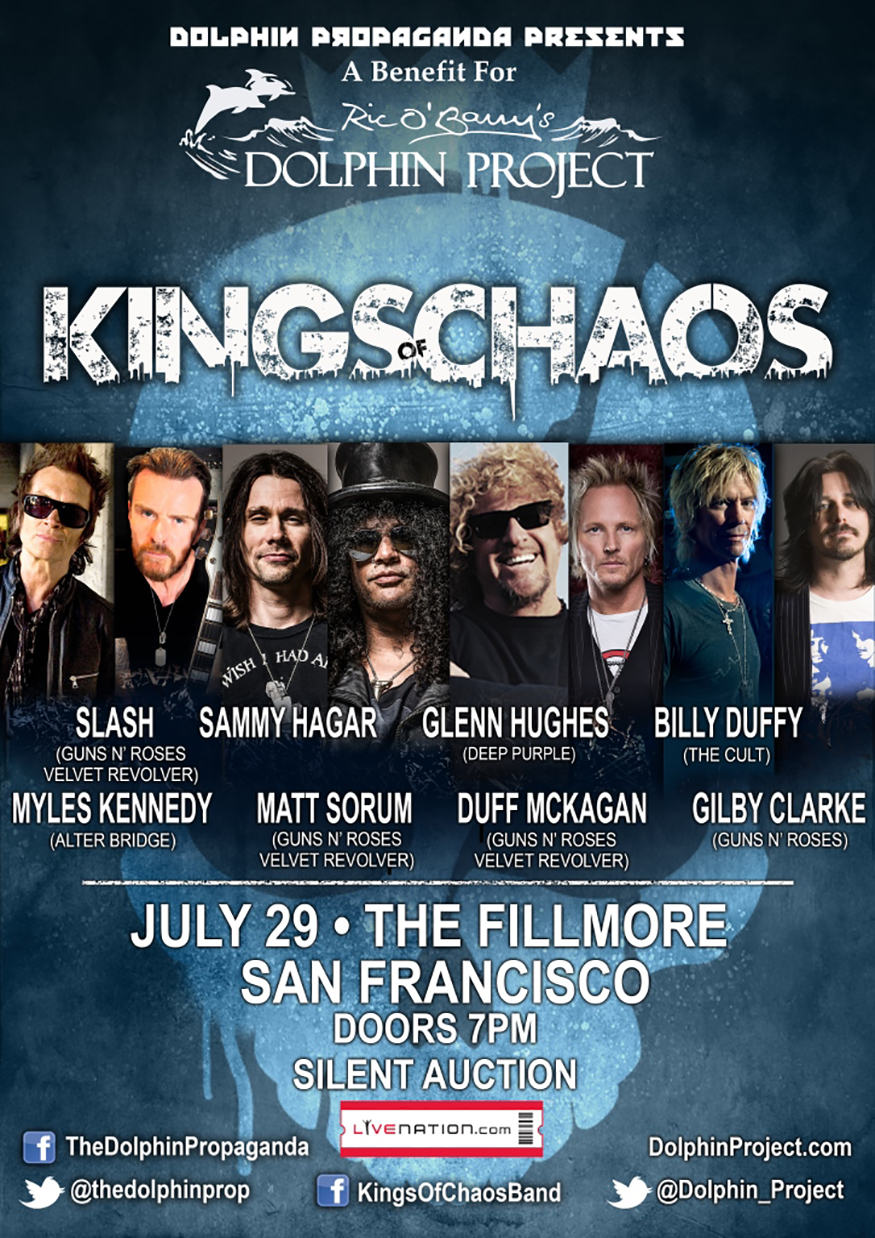 The Kings of Chaos are a band of veteran rock royalty, featuring a core lineup of Guns N’ Roses and Velvet Revolver members Matt Sorum, Duff McKagan, and Gilby Clarke as well as a revolving lineup of members of Aerosmith, Def Leppard, and Deep Purple. The band is set to play a very special benefit concert at the historic Fillmore in San Francisco, on Wednesday July 29th. The benefit is for the Dolphin Project, which was started by Ric O’barry, following his internationally acclaimed documentary, “The Cove”. For the San Francisco show the line up in the band will include, rock legends Slash (Guns N’ Roses, Velvet Revolver), Sammy Hagar (Van Halen), Matt Sorum (Guns N’ Roses), Gilby Clarke, Duff McKagan (Guns N’ Roses, Velvet Revolver), Billy Duffy (The Cult), Glenn Hughes (Deep Purple) and Myles Kennedy (Alter Bridge).