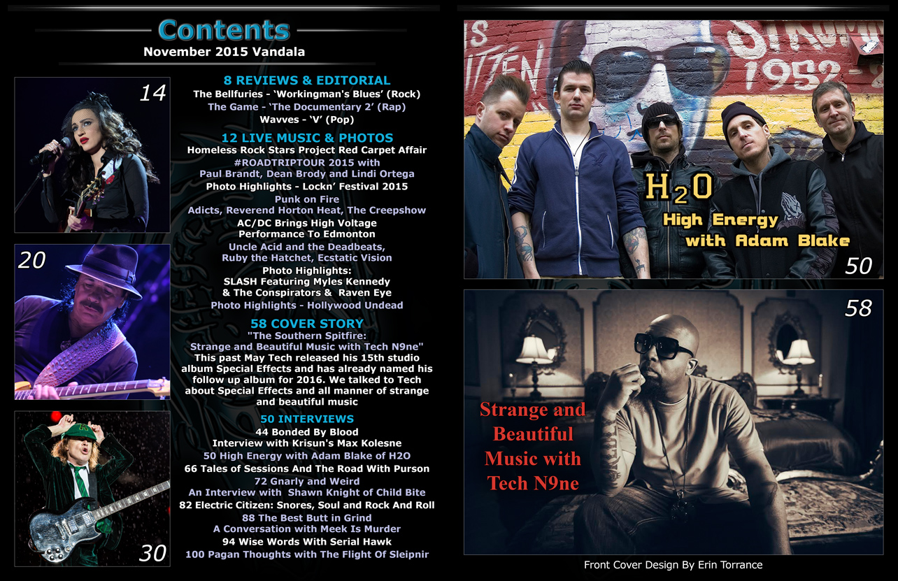 November we have the honour of having Southern Spitfire Tech N9ne on the cover with an in-depth interview about his albums and label. Death Metal band Krisiun is hard on the road and drummer Max Kolesne made time to chat with us. Plus with a 7 year break between albums Adam Blake of H20 sat down to talk about the new album. We were also busy in the rain, cold, heat, you name it to catch some of the best live music out there with ACDC, Slash, Paul Brandt, Dean Brody, Lockn’ Festival and more. This and many more interviews, reviews and much more in this month’s interview. READ HERE FREE