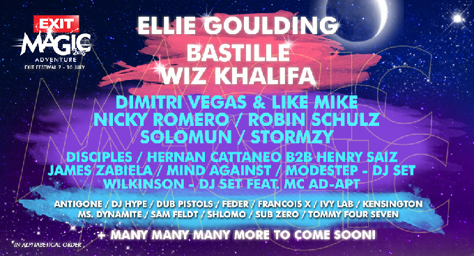 Exit Festival will be held this year from 7 to 10 July at the Petrovaradin Fortress, after which Exit Adventure moves to the Adriatic Sea for the third annual Sea Dance Festival**, held from 14 to 16 July. Confirmed acts already include Ellie Goulding, Wiz Khalifa, Bastille, Dimitri Vegas & Like Mike, Stormzy, Lost Frequencies, Solomun, Robin Schulz, Nicky Romero, Ms. Dynamite, Zomboy, Wilkinson, Mind Against, Disciples, Dub Pistols, Kensington, Feder, Sam Feldt, DJ Hype, Andy C, Modestep, Ivy Lab, Sub Zero, Hernan Cattaneo b2b Henry Saiz, James Zabiela, Tomm**y Four Seven, Antigone, Francois X and Shlømo.