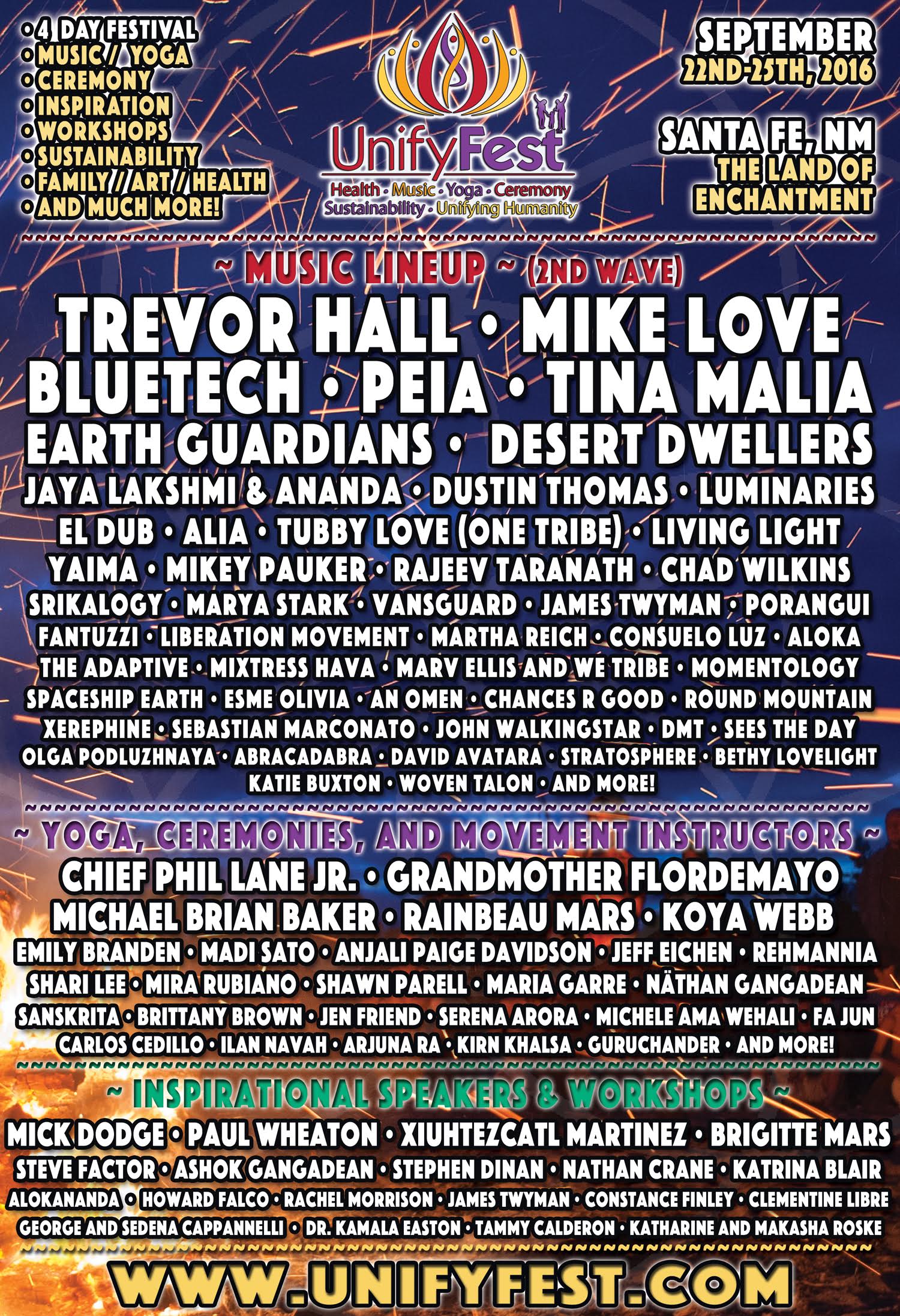 The festival boasts a music lineup of more than 50 musical acts including Trevor Hall,Mike Love, Bluetech, Desert Dwellers, Tina Malia, Luminaries, Earth Guardians, and many exciting headliners still to be announced. This mixture of rock, electronic, reggae, dance, and indigenous world music makes Unify a can’t-miss event for all fans of conscious music and nightlife. Music will alternate between four stages until midnighteach day followed by an acoustic chill-lounge running until 3am each night; transforming Santa Fe into the most upbeat and high-vibe party in New Mexico.