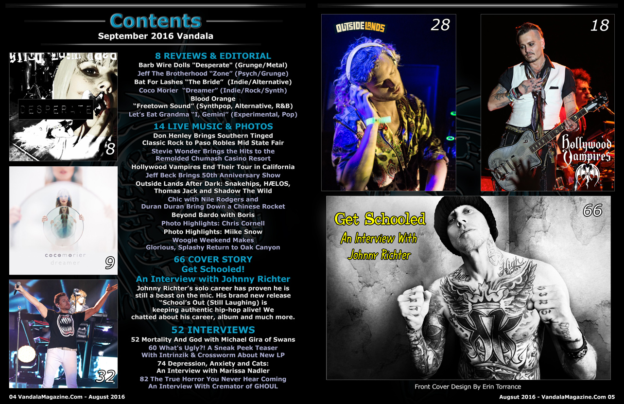 The fall is coming along with cooler temperatures but the music and new releases are just starting. On the cover, we have an interview with Johnny Richter about his new album, music and more. Plus we have a sneak peek teaser with Intrinzik & Crossworm about the upcoming new LP. We also caught up with Michael Gira of Swans, Marissa Nadler, Cremator of GHOUL. Also, we hit a ton of shows this month featuring Hollywood Vampires, Chris Cornell, Snakehips, HÆLOS, Don Henley, Stevie Wonder, Nile Rodgers, Duran Duran, Miike Snow, Boris and more. This and much more along with our regular features. READ HERE FREE