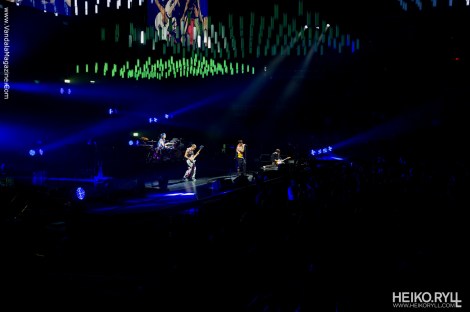 The show kicked off with three way intro jam that combined Funk, Blues and Rock in a way that only the RHCP could pull off. “Around the World” brought Anthony to the stage and 1000 lights started their dance. The chemistry of the band goes beyond the music as all the members become one symbiotic entity created my the songs that allow them to all move in uncontrollable ways and never once come in contact with each other. Anthony spins all over the stage while Flea hops and thrusts, Josh bends and thrashes all in perfect time and dynamics to Chad’s rhythms.