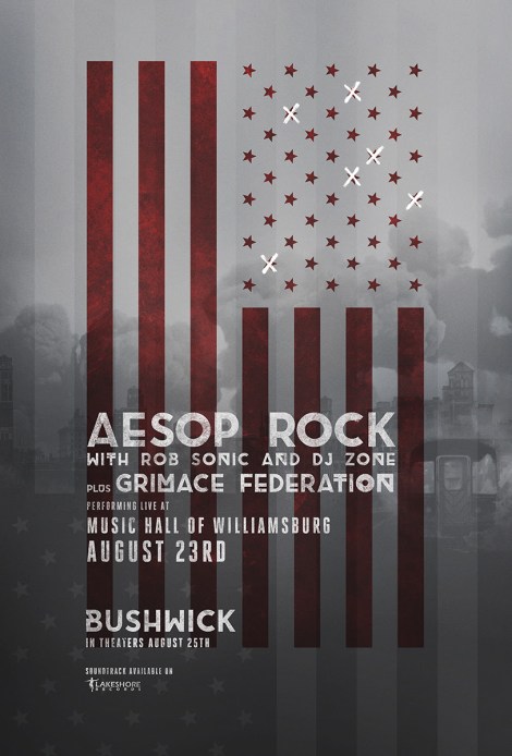 Bushwick hits theaters on August 25th, and to celebrate its release, Aesop Rock (with Rob Sonic and DJ Zone) and Grimace Federation will be performing on August 23rd at the Music Hall of Williamsburg in NYC.