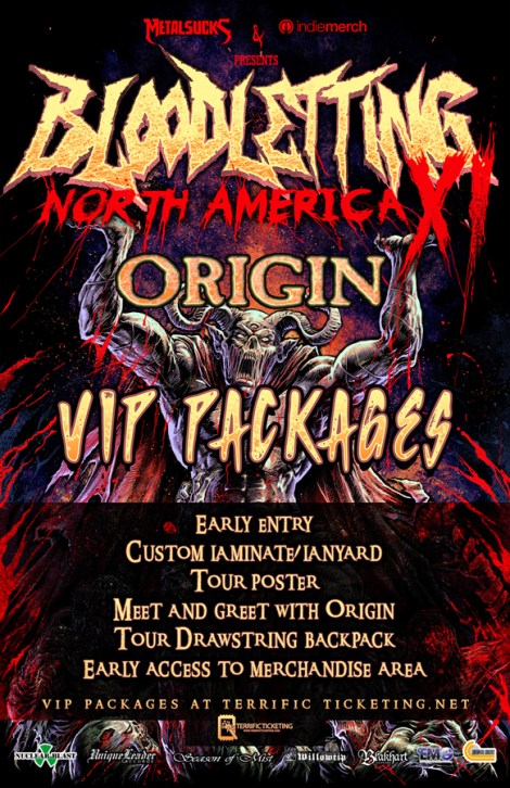 Genre defining technical death metal giants ORIGIN are proud to announce their Bloodletting North American headlining tour. Presented by MetalSucks, IndieMerch, and Blakhart Guitars, the 27-date tour will commence on October 20th at the The Riot Room in Kansas City and make stops in New York, Atlanta and Vancouver before concluding at The Roxy Theatre in Denver, CO on November 18th. Direct support will come from Canadian technical death metal band, ARCHSPIRE, and German death metal quartet, DEFEATED SANITY. The band will have death metallers, DYSCARNATE; Baltimore Brutal Death Metal band, VISCERAL DISGORGE; and California death metal legion, THE KENNEDY VEIL; open the shows each night.