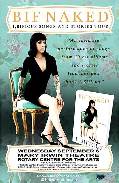 Rock.It Boy Entertainment presents BIF NAKED – I BIFICUS SONGS AND STORIES TOUR Wednesday, September 6 at the Mary Irwin Theatre, Rotary Centre For The Arts, 421 Cawston Avenue, Kelowna. Tickets are $42.50 (plus Facility Fee and Service Charges), available at the Box Office (Monday – Friday: 8:00am – 8:00pm, Saturday 12:00pm – 8:00pm) or online at www.selectyourtickets.com.