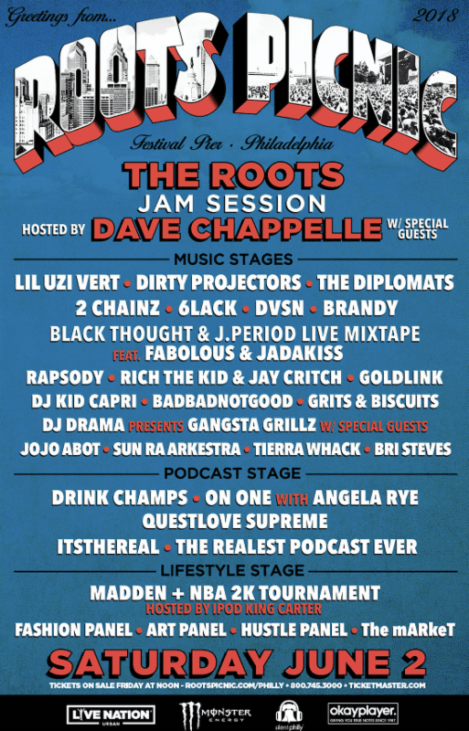 In addition to performances from superstars such as Lil Uzi Vert, Dirty Projectors, The Diplomats, 2 Chainz, Dvsn, Brandy and more, the day includes a bevy of one-of-a-kind moments exclusive to “Roots Picnic.” Among those, fans can enjoy Black Thought’s Live Mixtape feat. Fabolous & Jadakiss in what promises to be a display of pure lyrical fireworks, while DJ Drama presents Gangsta Grillz with special guests. In game-changing fashion, this is the first year of the Podcast Stage which plays host to live podcasts such as Drink Champs, On One with Angela Rye, Questlove Supreme, and more. Going beyond music, the Lifestyle Stage offers a MADDEN & NBA2K Tournament hosted by iPod King Carter as well as a Fashion Panel, an Art Panel, Hustle Panel and an art market featuring local vendors called The mARkeT.