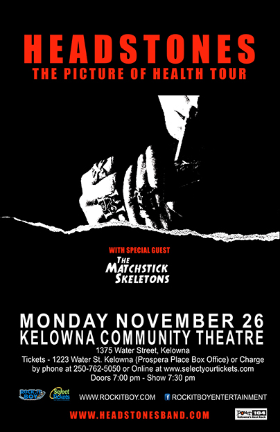 Rock.It Boy Entertainment presents HEADSTONES – THE PICTURE OF HEALTH TOUR WITH SPECIAL GUEST THE MATCHSTICK SKELETONSon Monday, November 26at the Kelowna Community Theatre, 1375 Water Street, Kelowna. Tickets are $42.50 (plus Facility Fee & Service Charges)at the Prospera Place Box Office, 1223 Water Street. Charge by phone at 250-762-5050or online at www.selectyourtickets.com.