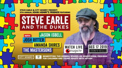 The leading live music platform for concert recordings and live streams, nugs.net, will live stream The 5th Annual John Henry’s Friends Benefit, presented by Steve Earle and City Winery. The event takes place at The Town Hall in New York City, NY on Tuesday, December 17, 2019 at 8pm ET.Steve Earle & The Dukes will be headlining the event. Jason Isbell and Amanda Shires, Josh Ritter, and The Mastersons will each join with sets of their own, making for an unforgettable night of amazing music. Fans can pay-per-view (PPV) the benefit event for $19.99 on nugs.tv at 8:00pm ET (5:00pm PT, 6:00pm MT, 7:00pm CT).