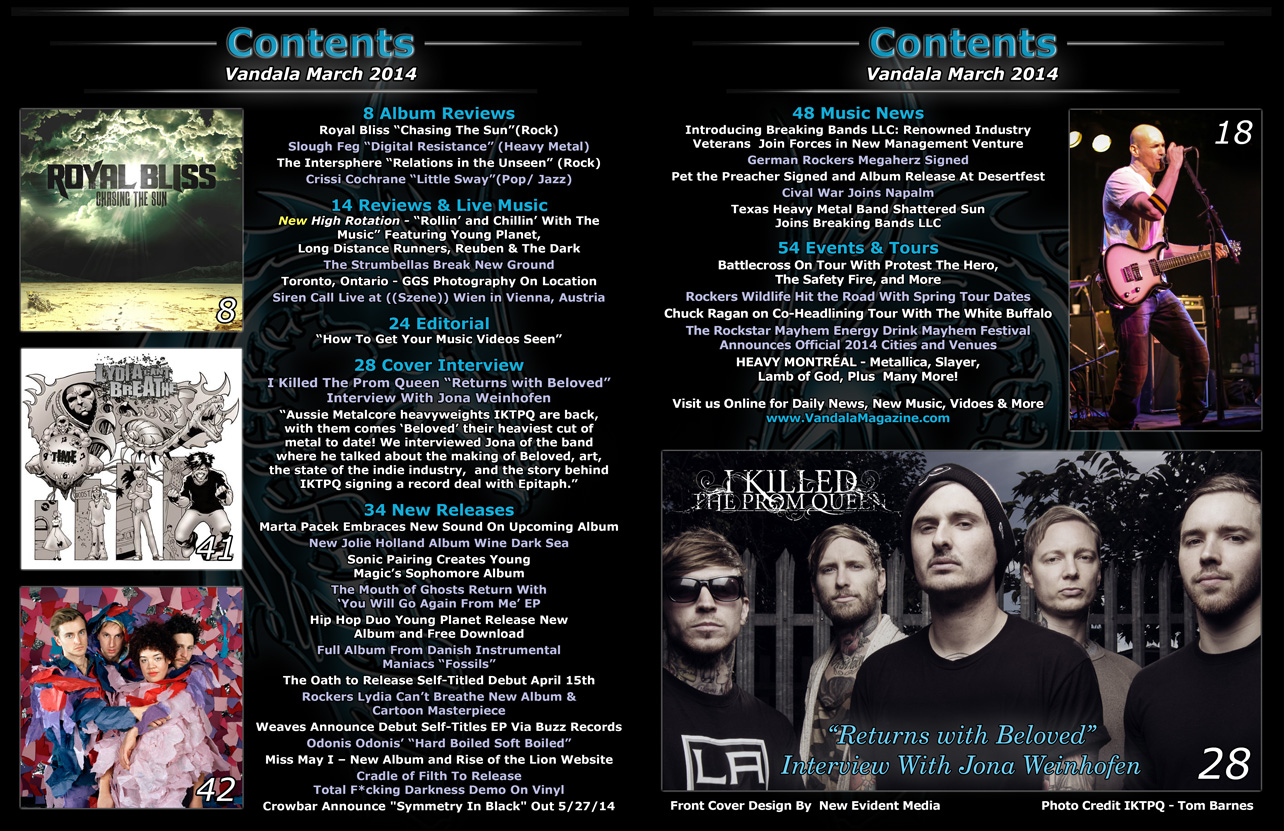 March we have I Killed the Prom Queen gracing the cover as they mark their return with “Beloved”. Vandala had a great interview with Jona Weinhofen talking about the making of the album, the independent scene and more. We have also added few more contributors from across the world! Photos from Austria to show reviews in Toronto. Even our editor gave a review of an album a perfect score! Plus our regular features, news, new releases and more. Also don’t forget to check out our new daily site at http://www.vandalamagazine.com